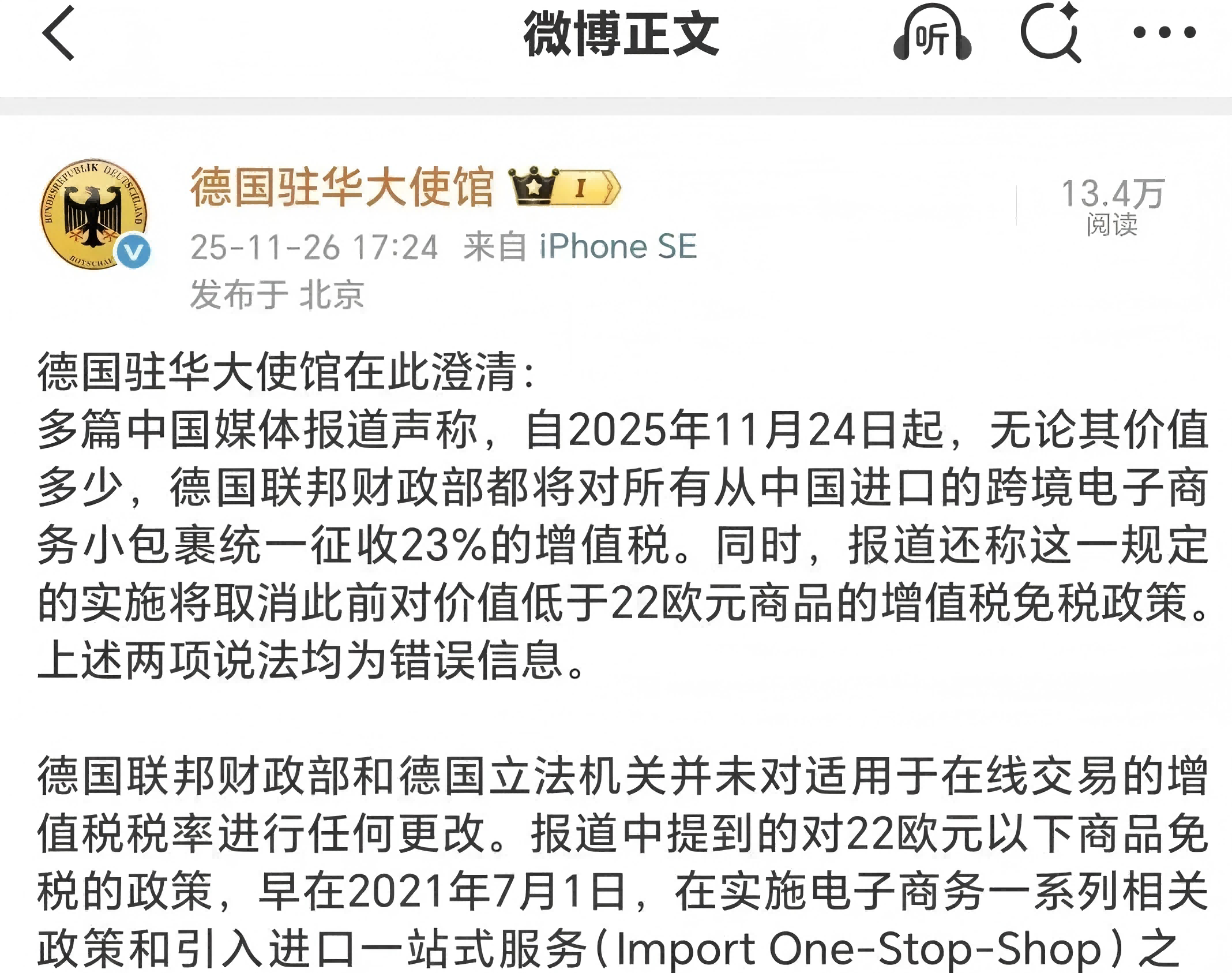 据获悉:11月26日,针对目前市场上流传的所谓“德国对中国跨境小包征收23%增值税”及“取消此前对价值低于22欧元商品的增值税免税政策”的两个传闻,德国驻华大使馆通过官方微博发布澄清公告,宣布上述说法均为错误信息!