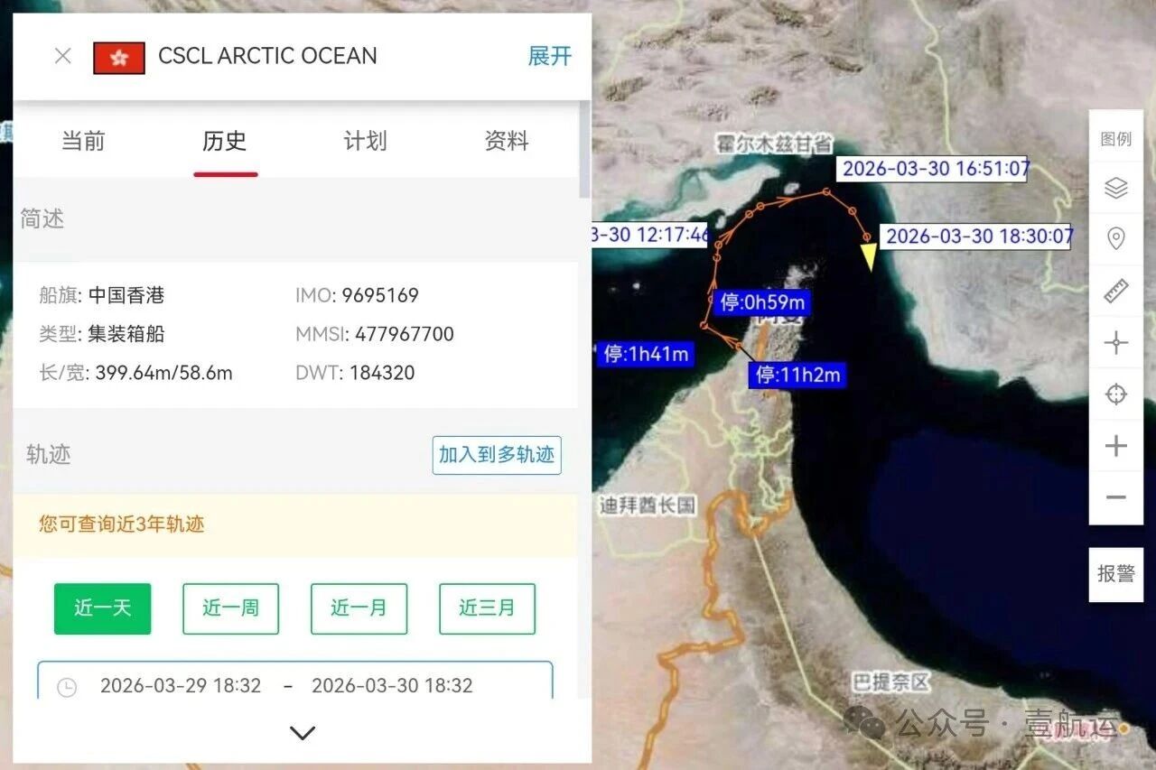 据悉:来自 AIS 的数据和 marinetraffic 网站报道显示,上周五(27日)曾尝试穿越霍尔木兹海峡失败的“中海北冰洋”轮(CSCL ARCTIC OCEAN)和“中海印度洋”轮(CSCL INDIAN OCEAN)已经于昨日(3月30日),再度启航驶往霍尔木兹海峡。