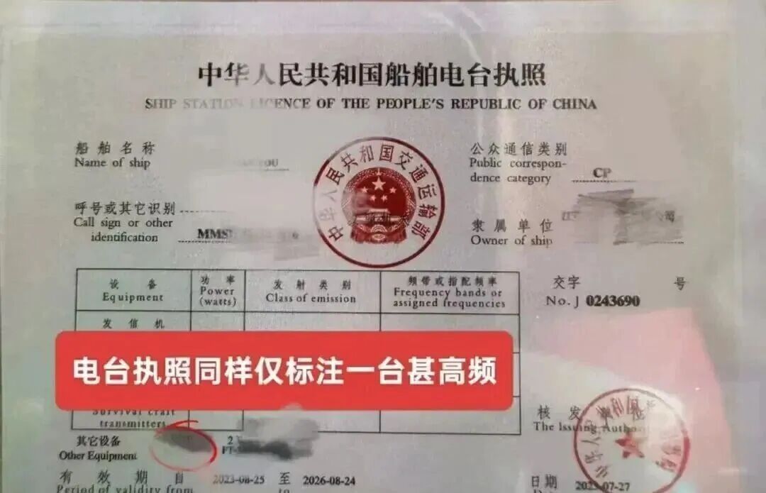 近日,武汉青山海事处工业港海巡执法大队执法人员在对某危险品船舶进行现场监督检查时,在驾驶台发现一处异常高频接头,线路走向十分隐蔽。面对执法人员盘问,船员言语含糊、神情紧张,无法说明用途。执法人员立即警觉,开展全面排查,在隐蔽位置查获一台私自存放的大功率甚高频设备。在后续核对船舶检验证书与电台执照时,执法人员发现了更为关键的船检质量问题:该船为2005年安装龙骨,且船舶总吨为934吨,根据《内河船舶法定检验技术规则(2004)》规定,此类船舶应配备两台甚高频设备。然而,该船船舶检验证书与电台执照上均仅标注一台“FT-805B”甚高频设备,存在明显的“证船不符”及检验发证漏项问题。