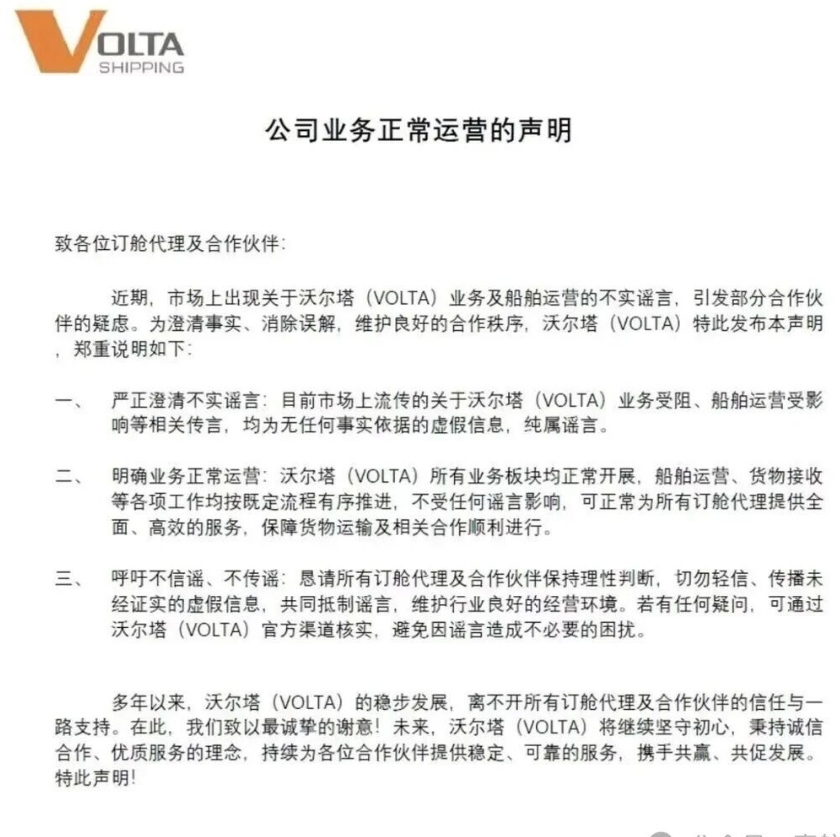 据悉,近日,市场出现诸多关于沃尔塔航运业务受阻、船舶运营面临撤船、停航的传闻。4月2日,沃尔塔航运发布官方声明,对于相关传闻做出澄清,全面否认了相关传闻!公司声明;目前市场上流传的关于沃尔塔业务受阻、船舶运营受影响等相关传言,均属谣言。沃尔塔所有业务板块均正常开展,若有任何疑问,可通过沃尔塔官方渠道核实,避免因谣言造成不必要的困扰。