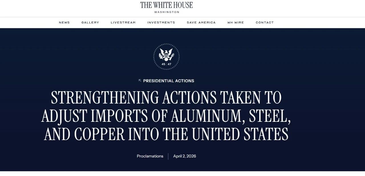 最核心的变化是关税改为按“整件商品总价值”征收,不再看“金属含量占多少,2026年4月6日(美东时间)正式实施。50%主流关税是钢、铝和大部分相关衍生品;25%关税是部分铜产品和部分衍生品‘’